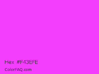 Hex #f43efe Color is a light magenta color and the nearest color is Purple Pizzazz #fe4eda. Hex code #f43efe and RGB value is rgb(244,62,254). In RGB color space, this color is composed of 96% red, 24% green, 100% blue, In CMYK color space, this color is composed of 4% cyan, 76% magenta, 0% yellow , 0% black , In HSL color space, this color has a hue angle of 297° , 99% saturation and 62% lightness.