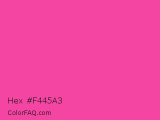Hex #f445a3 Color is a light rose color and the nearest color is Rose Bonbon #f9429e. Hex code #f445a3 and RGB value is rgb(244,69,163). In RGB color space, this color is composed of 96% red, 27% green, 64% blue, In CMYK color space, this color is composed of 0% cyan, 72% magenta, 33% yellow , 4% black , In HSL color space, this color has a hue angle of 328° , 89% saturation and 61% lightness.