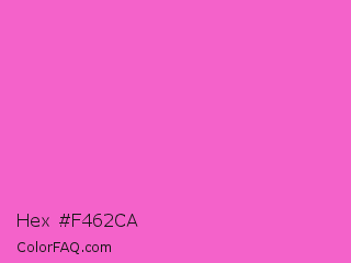 Hex #f462ca Color is a light magenta color and the nearest color is Rose Pink #ff66cc. Hex code #f462ca and RGB value is rgb(244,98,202). In RGB color space, this color is composed of 96% red, 38% green, 79% blue, In CMYK color space, this color is composed of 0% cyan, 60% magenta, 17% yellow , 4% black , In HSL color space, this color has a hue angle of 317° , 87% saturation and 67% lightness.