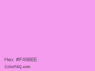 Hex #f49bee Color is a light magenta color and the nearest color is Lavender Rose #fba0e3. Hex code #f49bee and RGB value is rgb(244,155,238). In RGB color space, this color is composed of 96% red, 61% green, 93% blue, In CMYK color space, this color is composed of 0% cyan, 36% magenta, 2% yellow , 4% black , In HSL color space, this color has a hue angle of 304° , 80% saturation and 78% lightness.