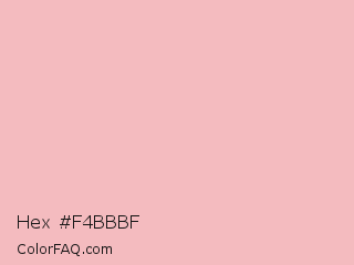 Hex #f4bbbf Color is a very light red color and the nearest color is Spanish Pink #f7bfbe. Hex code #f4bbbf and RGB value is rgb(244,187,191). In RGB color space, this color is composed of 96% red, 73% green, 75% blue, In CMYK color space, this color is composed of 0% cyan, 23% magenta, 22% yellow , 4% black , In HSL color space, this color has a hue angle of 356° , 72% saturation and 85% lightness.