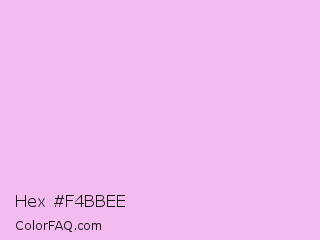 Hex #f4bbee Color is a very light magenta color and the nearest color is French Lilac #ecc7ee. Hex code #f4bbee and RGB value is rgb(244,187,238). In RGB color space, this color is composed of 96% red, 73% green, 93% blue, In CMYK color space, this color is composed of 0% cyan, 23% magenta, 2% yellow , 4% black , In HSL color space, this color has a hue angle of 306° , 72% saturation and 85% lightness.