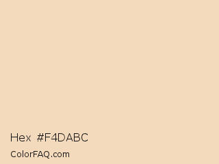 Hex #f4dabc Color is a very light orange color and the nearest color is Dutch White #efdfbb. Hex code #f4dabc and RGB value is rgb(244,218,188). In RGB color space, this color is composed of 96% red, 85% green, 74% blue, In CMYK color space, this color is composed of 0% cyan, 11% magenta, 23% yellow , 4% black , In HSL color space, this color has a hue angle of 32° , 72% saturation and 85% lightness.