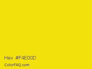 Hex #f4e00d Color is a normal yellow color and the nearest color is Lemon #fde910. Hex code #f4e00d and RGB value is rgb(244,224,13). In RGB color space, this color is composed of 96% red, 88% green, 5% blue, In CMYK color space, this color is composed of 0% cyan, 8% magenta, 95% yellow , 4% black , In HSL color space, this color has a hue angle of 55° , 91% saturation and 50% lightness.
