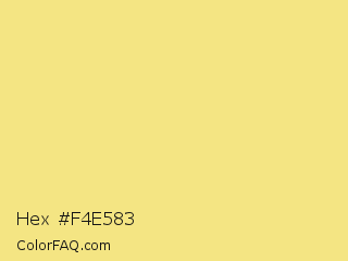 Hex #f4e583 Color is a light yellow color and the nearest color is Sahara Sand #f1e788. Hex code #f4e583 and RGB value is rgb(244,229,131). In RGB color space, this color is composed of 96% red, 90% green, 51% blue, In CMYK color space, this color is composed of 0% cyan, 6% magenta, 46% yellow , 4% black , In HSL color space, this color has a hue angle of 52° , 84% saturation and 74% lightness.