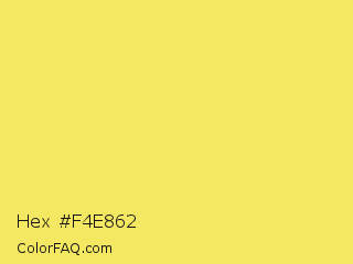 Hex #f4e862 Color is a light yellow color and the nearest color is Portica #f9e663. Hex code #f4e862 and RGB value is rgb(244,232,98). In RGB color space, this color is composed of 96% red, 91% green, 38% blue, In CMYK color space, this color is composed of 0% cyan, 5% magenta, 60% yellow , 4% black , In HSL color space, this color has a hue angle of 55° , 87% saturation and 67% lightness.