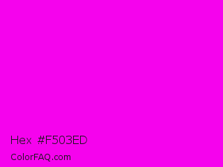 Hex #f503ed Color is a normal magenta color and the nearest color is Magenta / Fuchsia #ff00ff. Hex code #f503ed and RGB value is rgb(245,3,237). In RGB color space, this color is composed of 96% red, 1% green, 93% blue, In CMYK color space, this color is composed of 0% cyan, 99% magenta, 3% yellow , 4% black , In HSL color space, this color has a hue angle of 302° , 98% saturation and 49% lightness.