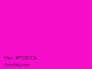 Hex #f50dca Color is a normal magenta color and the nearest color is Shocking Pink #fc0fc0. Hex code #f50dca and RGB value is rgb(245,13,202). In RGB color space, this color is composed of 96% red, 5% green, 79% blue, In CMYK color space, this color is composed of 0% cyan, 95% magenta, 18% yellow , 4% black , In HSL color space, this color has a hue angle of 311° , 92% saturation and 51% lightness.