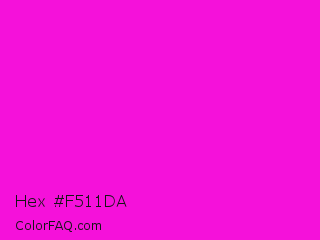 Hex #f511da Color is a normal magenta color and the nearest color is Hot Magenta #ff1dce. Hex code #f511da and RGB value is rgb(245,17,218). In RGB color space, this color is composed of 96% red, 7% green, 85% blue, In CMYK color space, this color is composed of 0% cyan, 93% magenta, 11% yellow , 4% black , In HSL color space, this color has a hue angle of 307° , 92% saturation and 51% lightness.