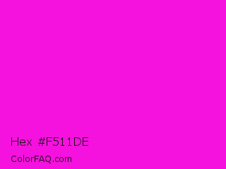 Hex #f511de Color is a normal magenta color and the nearest color is Hot Magenta #ff1dce. Hex code #f511de and RGB value is rgb(245,17,222). In RGB color space, this color is composed of 96% red, 7% green, 87% blue, In CMYK color space, this color is composed of 0% cyan, 93% magenta, 9% yellow , 4% black , In HSL color space, this color has a hue angle of 306° , 92% saturation and 51% lightness.