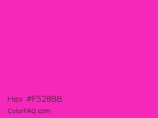 Hex #f528bb Color is a normal magenta color and the nearest color is Razzle Dazzle Rose #ff33cc. Hex code #f528bb and RGB value is rgb(245,40,187). In RGB color space, this color is composed of 96% red, 16% green, 73% blue, In CMYK color space, this color is composed of 0% cyan, 84% magenta, 24% yellow , 4% black , In HSL color space, this color has a hue angle of 317° , 91% saturation and 56% lightness.
