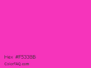 Hex #f533bb Color is a normal magenta color and the nearest color is Razzle Dazzle Rose #ff33cc. Hex code #f533bb and RGB value is rgb(245,51,187). In RGB color space, this color is composed of 96% red, 20% green, 73% blue, In CMYK color space, this color is composed of 0% cyan, 79% magenta, 24% yellow , 4% black , In HSL color space, this color has a hue angle of 318° , 91% saturation and 58% lightness.