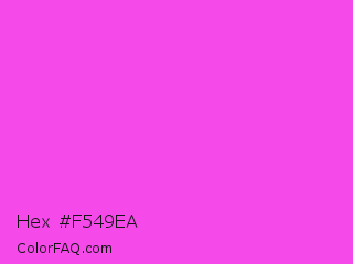 Hex #f549ea Color is a light magenta color and the nearest color is Purple Pizzazz #fe4eda. Hex code #f549ea and RGB value is rgb(245,73,234). In RGB color space, this color is composed of 96% red, 29% green, 92% blue, In CMYK color space, this color is composed of 0% cyan, 70% magenta, 4% yellow , 4% black , In HSL color space, this color has a hue angle of 304° , 90% saturation and 62% lightness.