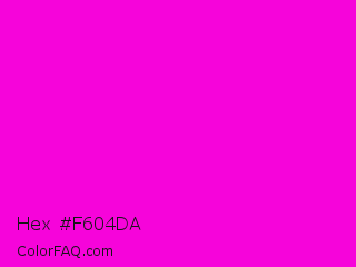Hex #f604da Color is a normal magenta color and the nearest color is Purple Pizzazz #ff00cc. Hex code #f604da and RGB value is rgb(246,4,218). In RGB color space, this color is composed of 96% red, 2% green, 85% blue, In CMYK color space, this color is composed of 0% cyan, 98% magenta, 11% yellow , 4% black , In HSL color space, this color has a hue angle of 307° , 97% saturation and 49% lightness.