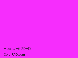 Hex #f62dfd Color is a normal magenta color and the nearest color is Magenta / Fuchsia #ff00ff. Hex code #f62dfd and RGB value is rgb(246,45,253). In RGB color space, this color is composed of 96% red, 18% green, 99% blue, In CMYK color space, this color is composed of 3% cyan, 82% magenta, 0% yellow , 1% black , In HSL color space, this color has a hue angle of 298° , 98% saturation and 58% lightness.