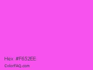 Hex #f652ee Color is a light magenta color and the nearest color is Purple Pizzazz #fe4eda. Hex code #f652ee and RGB value is rgb(246,82,238). In RGB color space, this color is composed of 96% red, 32% green, 93% blue, In CMYK color space, this color is composed of 0% cyan, 67% magenta, 3% yellow , 4% black , In HSL color space, this color has a hue angle of 303° , 90% saturation and 64% lightness.
