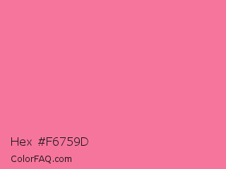 Hex #f6759d Color is a light rose color and the nearest color is Cyclamen #f56fa1. Hex code #f6759d and RGB value is rgb(246,117,157). In RGB color space, this color is composed of 96% red, 46% green, 62% blue, In CMYK color space, this color is composed of 0% cyan, 52% magenta, 36% yellow , 4% black , In HSL color space, this color has a hue angle of 341° , 88% saturation and 71% lightness.