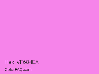 Hex #f684ea Color is a light magenta color and the nearest color is Light Fuchsia Pink #f984ef. Hex code #f684ea and RGB value is rgb(246,132,234). In RGB color space, this color is composed of 96% red, 52% green, 92% blue, In CMYK color space, this color is composed of 0% cyan, 46% magenta, 5% yellow , 4% black , In HSL color space, this color has a hue angle of 306° , 86% saturation and 74% lightness.