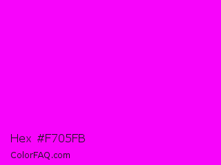 Hex #f705fb Color is a normal magenta color and the nearest color is Magenta / Fuchsia #ff00ff. Hex code #f705fb and RGB value is rgb(247,5,251). In RGB color space, this color is composed of 97% red, 2% green, 98% blue, In CMYK color space, this color is composed of 2% cyan, 98% magenta, 0% yellow , 2% black , In HSL color space, this color has a hue angle of 299° , 97% saturation and 50% lightness.