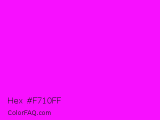 Hex #f710ff Color is a normal magenta color and the nearest color is Magenta / Fuchsia #ff00ff. Hex code #f710ff and RGB value is rgb(247,16,255). In RGB color space, this color is composed of 97% red, 6% green, 100% blue, In CMYK color space, this color is composed of 3% cyan, 94% magenta, 0% yellow , 0% black , In HSL color space, this color has a hue angle of 298° , 100% saturation and 53% lightness.