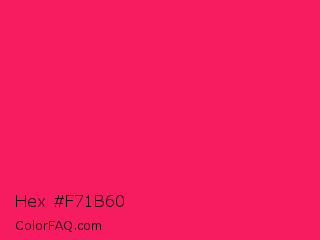Hex #f71b60 Color is a normal rose color and the nearest color is Awesome #ff2052. Hex code #f71b60 and RGB value is rgb(247,27,96). In RGB color space, this color is composed of 97% red, 11% green, 38% blue, In CMYK color space, this color is composed of 0% cyan, 89% magenta, 61% yellow , 3% black , In HSL color space, this color has a hue angle of 341° , 93% saturation and 54% lightness.