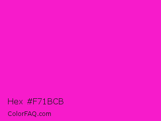 Hex #f71bcb Color is a normal magenta color and the nearest color is Hot Magenta #ff1dce. Hex code #f71bcb and RGB value is rgb(247,27,203). In RGB color space, this color is composed of 97% red, 11% green, 80% blue, In CMYK color space, this color is composed of 0% cyan, 89% magenta, 18% yellow , 3% black , In HSL color space, this color has a hue angle of 312° , 93% saturation and 54% lightness.