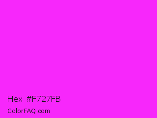 Hex #f727fb Color is a normal magenta color and the nearest color is Magenta / Fuchsia #ff00ff. Hex code #f727fb and RGB value is rgb(247,39,251). In RGB color space, this color is composed of 97% red, 15% green, 98% blue, In CMYK color space, this color is composed of 2% cyan, 84% magenta, 0% yellow , 2% black , In HSL color space, this color has a hue angle of 299° , 96% saturation and 57% lightness.