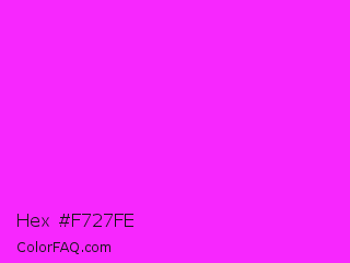 Hex #f727fe Color is a normal magenta color and the nearest color is Magenta / Fuchsia #ff00ff. Hex code #f727fe and RGB value is rgb(247,39,254). In RGB color space, this color is composed of 97% red, 15% green, 100% blue, In CMYK color space, this color is composed of 3% cyan, 85% magenta, 0% yellow , 0% black , In HSL color space, this color has a hue angle of 298° , 99% saturation and 57% lightness.