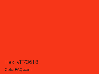 Hex #f73618 Color is a normal red color and the nearest color is Red RYB #fe2712. Hex code #f73618 and RGB value is rgb(247,54,24). In RGB color space, this color is composed of 97% red, 21% green, 9% blue, In CMYK color space, this color is composed of 0% cyan, 78% magenta, 90% yellow , 3% black , In HSL color space, this color has a hue angle of 8° , 93% saturation and 53% lightness.