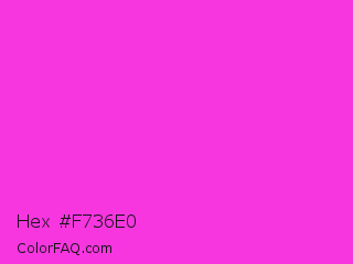 Hex #f736e0 Color is a normal magenta color and the nearest color is Razzle Dazzle Rose #ff33cc. Hex code #f736e0 and RGB value is rgb(247,54,224). In RGB color space, this color is composed of 97% red, 21% green, 88% blue, In CMYK color space, this color is composed of 0% cyan, 78% magenta, 9% yellow , 3% black , In HSL color space, this color has a hue angle of 307° , 92% saturation and 59% lightness.