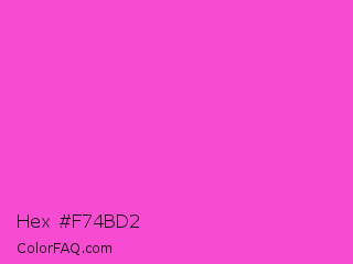 Hex #f74bd2 Color is a light magenta color and the nearest color is Purple Pizzazz #fe4eda. Hex code #f74bd2 and RGB value is rgb(247,75,210). In RGB color space, this color is composed of 97% red, 29% green, 82% blue, In CMYK color space, this color is composed of 0% cyan, 70% magenta, 15% yellow , 3% black , In HSL color space, this color has a hue angle of 313° , 91% saturation and 63% lightness.
