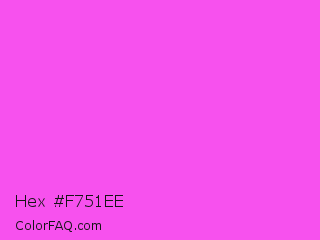 Hex #f751ee Color is a light magenta color and the nearest color is Purple Pizzazz #fe4eda. Hex code #f751ee and RGB value is rgb(247,81,238). In RGB color space, this color is composed of 97% red, 32% green, 93% blue, In CMYK color space, this color is composed of 0% cyan, 67% magenta, 4% yellow , 3% black , In HSL color space, this color has a hue angle of 303° , 91% saturation and 64% lightness.