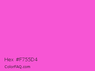 Hex #f755d4 Color is a light magenta color and the nearest color is Purple Pizzazz #fe4eda. Hex code #f755d4 and RGB value is rgb(247,85,212). In RGB color space, this color is composed of 97% red, 33% green, 83% blue, In CMYK color space, this color is composed of 0% cyan, 66% magenta, 14% yellow , 3% black , In HSL color space, this color has a hue angle of 313° , 91% saturation and 65% lightness.