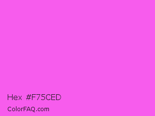 Hex #f75ced Color is a light magenta color and the nearest color is Pink Flamingo Crayola #ff66ff. Hex code #f75ced and RGB value is rgb(247,92,237). In RGB color space, this color is composed of 97% red, 36% green, 93% blue, In CMYK color space, this color is composed of 0% cyan, 63% magenta, 4% yellow , 3% black , In HSL color space, this color has a hue angle of 304° , 91% saturation and 66% lightness.