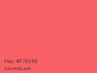 Hex #f76166 Color is a light red color and the nearest color is Carnation #f95a61. Hex code #f76166 and RGB value is rgb(247,97,102). In RGB color space, this color is composed of 97% red, 38% green, 40% blue, In CMYK color space, this color is composed of 0% cyan, 61% magenta, 59% yellow , 3% black , In HSL color space, this color has a hue angle of 358° , 90% saturation and 67% lightness.