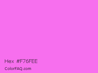 Hex #f76fee Color is a light magenta color and the nearest color is Pink Flamingo #fc74fd. Hex code #f76fee and RGB value is rgb(247,111,238). In RGB color space, this color is composed of 97% red, 44% green, 93% blue, In CMYK color space, this color is composed of 0% cyan, 55% magenta, 4% yellow , 3% black , In HSL color space, this color has a hue angle of 304° , 89% saturation and 70% lightness.