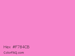 Hex #f784cb Color is a light magenta color and the nearest color is Princess Perfume #ff85cf. Hex code #f784cb and RGB value is rgb(247,132,203). In RGB color space, this color is composed of 97% red, 52% green, 80% blue, In CMYK color space, this color is composed of 0% cyan, 47% magenta, 18% yellow , 3% black , In HSL color space, this color has a hue angle of 323° , 88% saturation and 74% lightness.