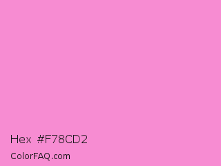 Hex #f78cd2 Color is a light magenta color and the nearest color is Princess Perfume #ff85cf. Hex code #f78cd2 and RGB value is rgb(247,140,210). In RGB color space, this color is composed of 97% red, 55% green, 82% blue, In CMYK color space, this color is composed of 0% cyan, 43% magenta, 15% yellow , 3% black , In HSL color space, this color has a hue angle of 321° , 87% saturation and 76% lightness.