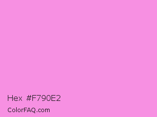 Hex #f790e2 Color is a light magenta color and the nearest color is Pale Magenta #f984e5. Hex code #f790e2 and RGB value is rgb(247,144,226). In RGB color space, this color is composed of 97% red, 56% green, 89% blue, In CMYK color space, this color is composed of 0% cyan, 42% magenta, 9% yellow , 3% black , In HSL color space, this color has a hue angle of 312° , 87% saturation and 77% lightness.