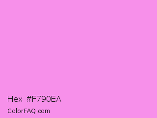 Hex #f790ea Color is a light magenta color and the nearest color is Light Fuchsia Pink #f984ef. Hex code #f790ea and RGB value is rgb(247,144,234). In RGB color space, this color is composed of 97% red, 56% green, 92% blue, In CMYK color space, this color is composed of 0% cyan, 42% magenta, 5% yellow , 3% black , In HSL color space, this color has a hue angle of 308° , 87% saturation and 77% lightness.