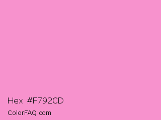 Hex #f792cd Color is a light magenta color and the nearest color is Pale Magenta Pink #ff99cc. Hex code #f792cd and RGB value is rgb(247,146,205). In RGB color space, this color is composed of 97% red, 57% green, 80% blue, In CMYK color space, this color is composed of 0% cyan, 41% magenta, 17% yellow , 3% black , In HSL color space, this color has a hue angle of 325° , 86% saturation and 77% lightness.