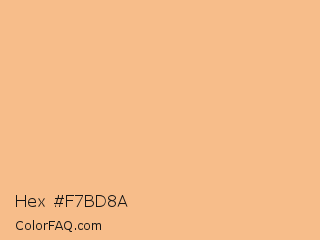 Hex #f7bd8a Color is a light orange color and the nearest color is Macaroni And Cheese #ffbd88. Hex code #f7bd8a and RGB value is rgb(247,189,138). In RGB color space, this color is composed of 97% red, 74% green, 54% blue, In CMYK color space, this color is composed of 0% cyan, 23% magenta, 44% yellow , 3% black , In HSL color space, this color has a hue angle of 28° , 87% saturation and 75% lightness.