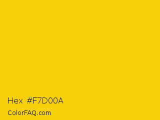 Hex #f7d00a Color is a normal yellow color and the nearest color is Safety Yellow #eed202. Hex code #f7d00a and RGB value is rgb(247,208,10). In RGB color space, this color is composed of 97% red, 82% green, 4% blue, In CMYK color space, this color is composed of 0% cyan, 16% magenta, 96% yellow , 3% black , In HSL color space, this color has a hue angle of 50° , 94% saturation and 50% lightness.