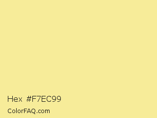 Hex #f7ec99 Color is a light yellow color and the nearest color is Primrose #edea99. Hex code #f7ec99 and RGB value is rgb(247,236,153). In RGB color space, this color is composed of 97% red, 93% green, 60% blue, In CMYK color space, this color is composed of 0% cyan, 4% magenta, 38% yellow , 3% black , In HSL color space, this color has a hue angle of 53° , 85% saturation and 78% lightness.