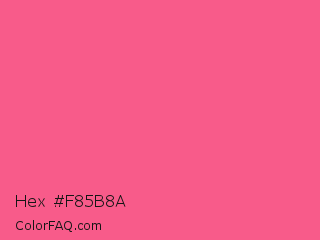 Hex #f85b8a Color is a light rose color and the nearest color is Strawberry #fc5a8d. Hex code #f85b8a and RGB value is rgb(248,91,138). In RGB color space, this color is composed of 97% red, 36% green, 54% blue, In CMYK color space, this color is composed of 0% cyan, 63% magenta, 44% yellow , 3% black , In HSL color space, this color has a hue angle of 342° , 92% saturation and 66% lightness.