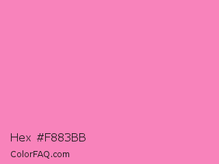 Hex #f883bb Color is a light rose color and the nearest color is Persian Pink #f77fbe. Hex code #f883bb and RGB value is rgb(248,131,187). In RGB color space, this color is composed of 97% red, 51% green, 73% blue, In CMYK color space, this color is composed of 0% cyan, 47% magenta, 25% yellow , 3% black , In HSL color space, this color has a hue angle of 331° , 89% saturation and 74% lightness.