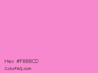 Hex #f888cd Color is a light magenta color and the nearest color is Princess Perfume #ff85cf. Hex code #f888cd and RGB value is rgb(248,136,205). In RGB color space, this color is composed of 97% red, 53% green, 80% blue, In CMYK color space, this color is composed of 0% cyan, 45% magenta, 17% yellow , 3% black , In HSL color space, this color has a hue angle of 323° , 89% saturation and 75% lightness.