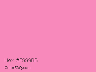 Hex #f889bb Color is a light rose color and the nearest color is Persian Pink #f77fbe. Hex code #f889bb and RGB value is rgb(248,137,187). In RGB color space, this color is composed of 97% red, 54% green, 73% blue, In CMYK color space, this color is composed of 0% cyan, 45% magenta, 25% yellow , 3% black , In HSL color space, this color has a hue angle of 333° , 89% saturation and 75% lightness.
