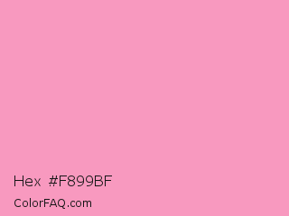 Hex #f899bf Color is a light rose color and the nearest color is Pastel Magenta #f49ac2. Hex code #f899bf and RGB value is rgb(248,153,191). In RGB color space, this color is composed of 97% red, 60% green, 75% blue, In CMYK color space, this color is composed of 0% cyan, 38% magenta, 23% yellow , 3% black , In HSL color space, this color has a hue angle of 336° , 87% saturation and 79% lightness.