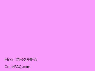 Hex #f89bfa Color is a light magenta color and the nearest color is Rich Brilliant Lavender #f1a7fe. Hex code #f89bfa and RGB value is rgb(248,155,250). In RGB color space, this color is composed of 97% red, 61% green, 98% blue, In CMYK color space, this color is composed of 1% cyan, 38% magenta, 0% yellow , 2% black , In HSL color space, this color has a hue angle of 299° , 90% saturation and 79% lightness.